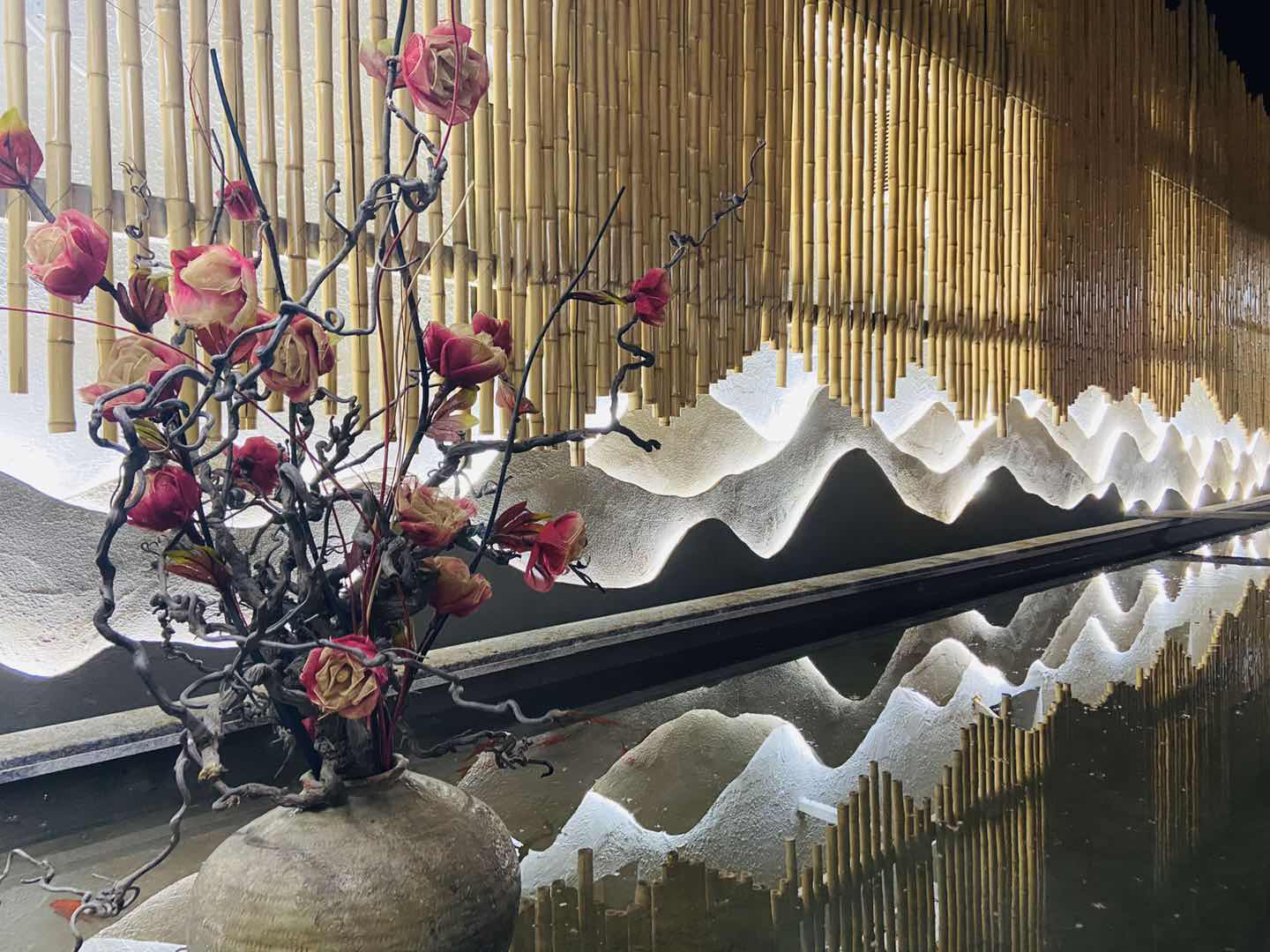 为了呈现洞穴的凹凸质感,在屋顶及墙壁上先用涨栓固定钢筋,形成层次分明的钢架结构,然后用钢筋焊接出洞穴的大致轮廓,灌入水泥,在制作的同时还要考虑到灯光、电线、水管的布置以及其他功能性的结构预制。洞穴主题是回归原始的一种形式,舒适度与艺术感仍旧是“凹凸”的硬核元素。
